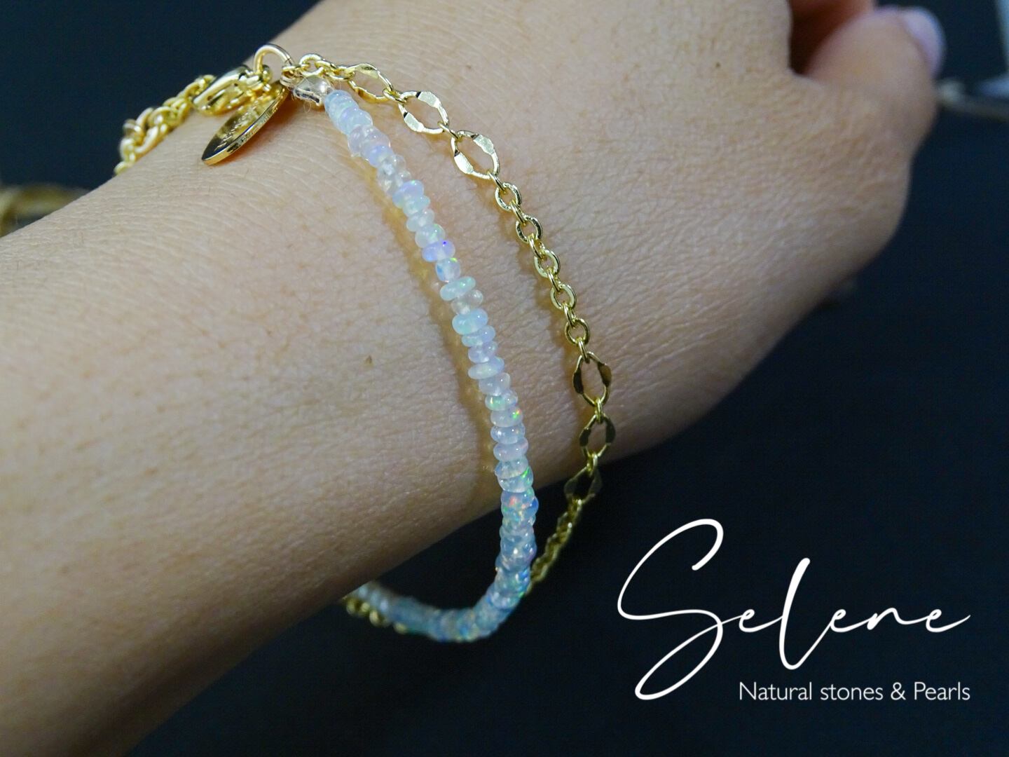 小粒で華奢ですが、遊色のキレイなエチオピアオパールとパール×チェーンの組み合わせがオシャレなブレスレットです!
