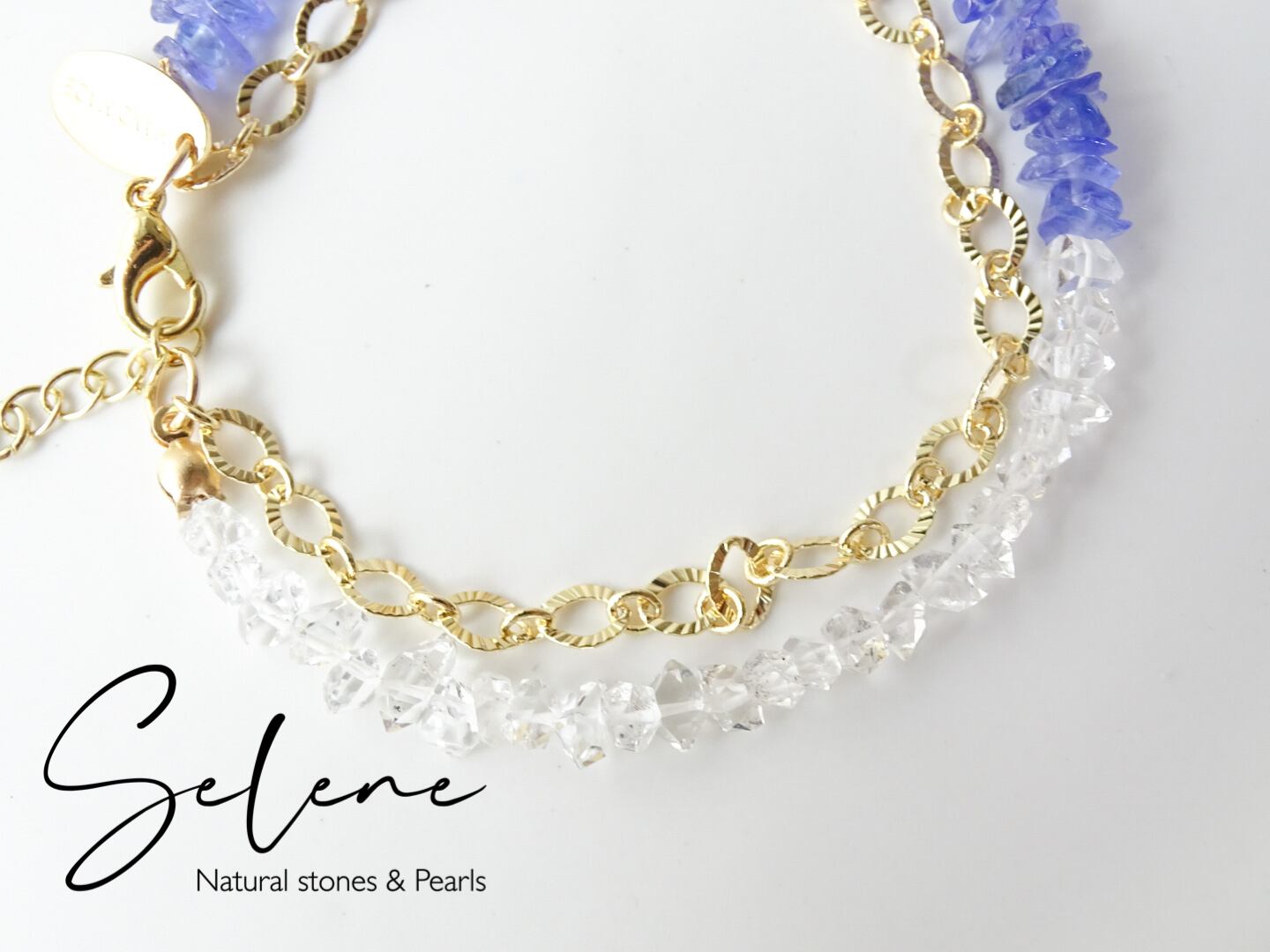 ブルーがとても素敵で希少なタンザナイトのさざれとキラキラのハーキマーダイヤモンドのブレスレットです。