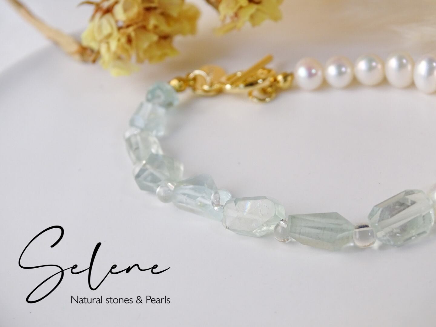 透明感がとてもキレイなアクアマリンとパールのブレスレットです!アクアマリンはエメラルドやモルガナイトの仲間で、透明感のあるものはとても希少でとっても高価な天然石。そんなアクアマリンを使用したとても美しいブレスレットです!