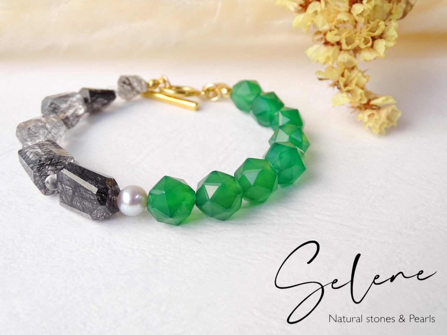 《 Blackrutile × Green onyx × Pearl 》Bracelet