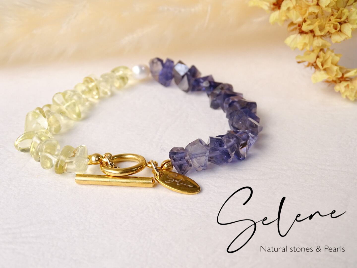 美しい青紫カラーのアイオライトは、レモンクォーツとの組み合わせで爽やかな仕上がりに!