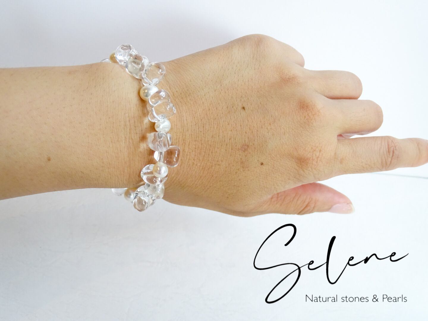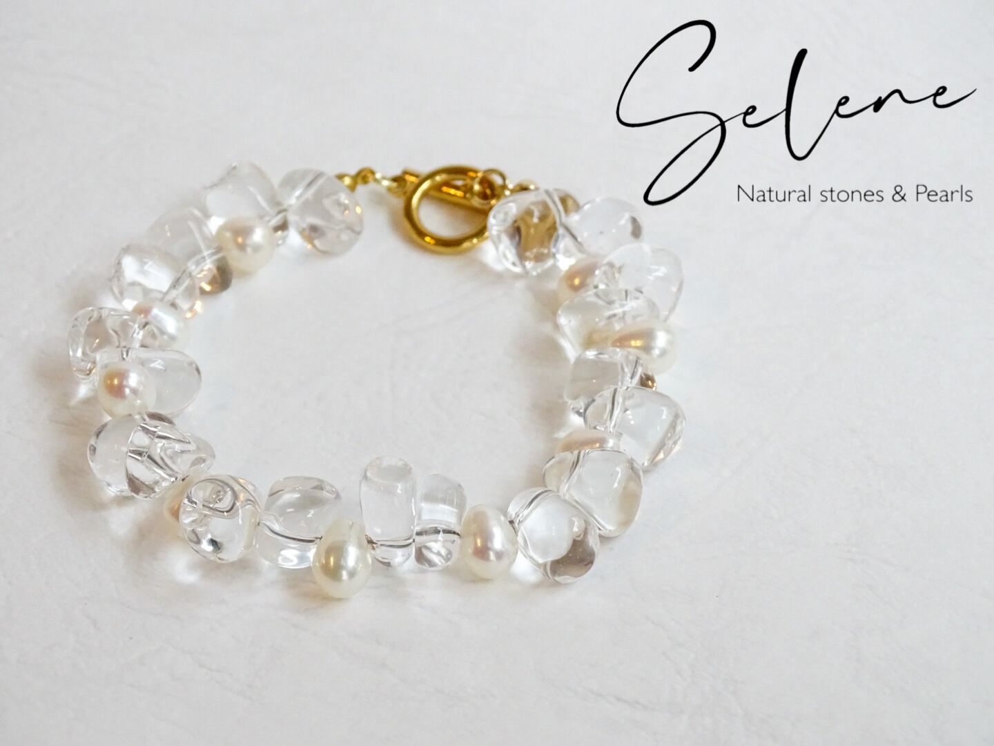 まるで水を腕にまとったようなツヤと透明感が抜群なクリスタルと、艶の良いパールを散りばめた贅沢なブレスレットです。
