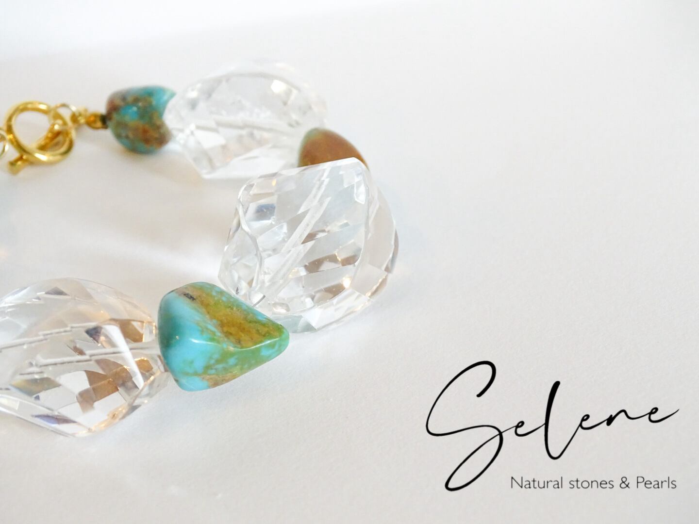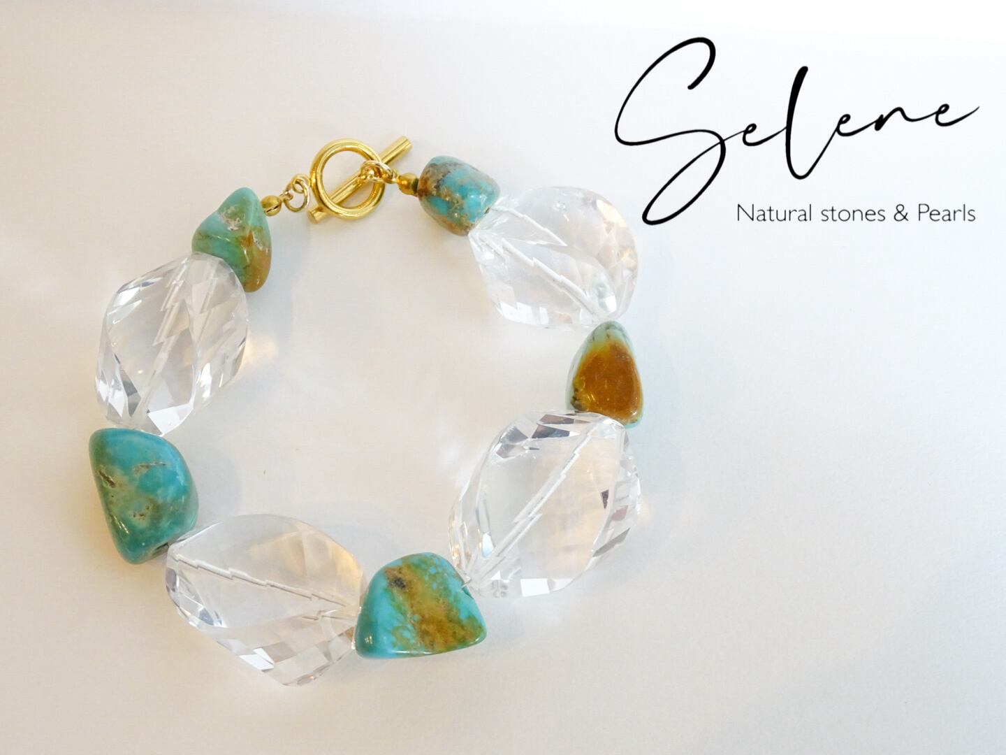 存在感たっぷりのこの大きなクリスタル水晶はオールドストックを使用しているので、今しか出会えないクリスタルです。ターコイズとの組合せで、夏らしい涼しげなブレスレットに仕上げました。