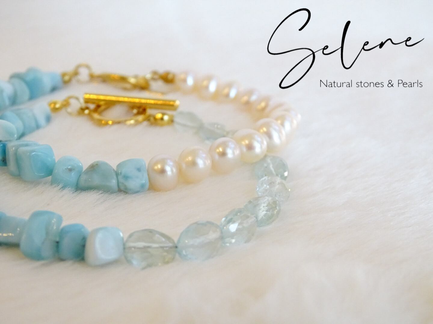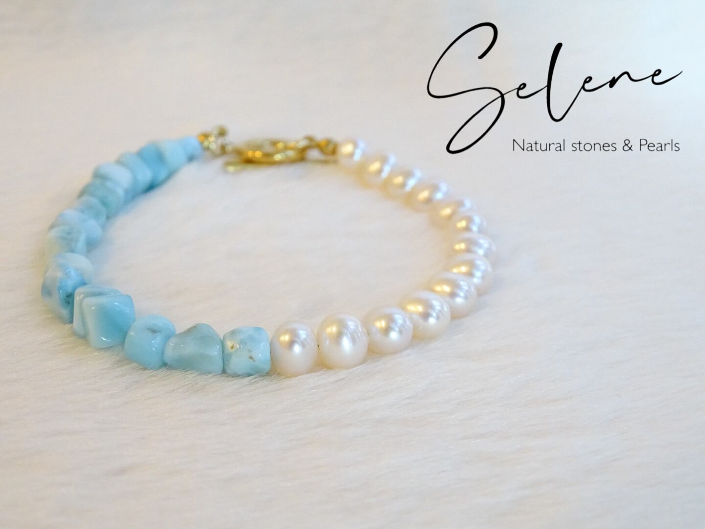 穏やかなブルーカラーの石たちが優雅に輝きます。Larimarはカリブ海でのみ産出される希少石で、その美しいブルーは海のような透明感と癒しのエネルギーを感じさせます。Aquamarineは淡いブルーカラーが特徴で、心を穏やかにし、コミュニケーションを円滑にしてくれる石です。そしてPearlは、上品な輝きが魅力であり、女性らしさを引き立ててくれます。このブレスレットは、普段使いはもちろん、特別なシーンやギフトにも最適です。一つ一つの石が異なる形や色味を持っているため、ご自身だけの特別な一点ものとなります。あなたの日常に幸せとパワーをもたらす、ブレスレットを手に入れてみませんか?