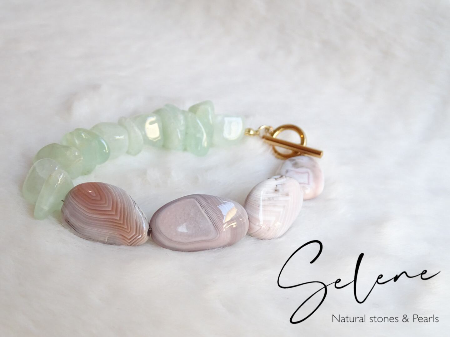 淡いカラーの花のような層になった模様が特徴のピンクボツワナアゲートと、パステルカラーがまろやかなプレナイトのブレスレット。南アフリカのボツワナ産アゲートとプレナイトを組み合わせたブレスレットです。天然石の美しさとパワーを手軽に身に着けられるアクセサリーとして人気を集めています。アゲートは落ち着きをもたらし、プレナイトは心身をリフレッシュしてくれると言われています。 このブレスレットは、単に装飾品としてだけでなく、身に着けることで石のパワーを感じることができると評判です。デイリーコーディネートにも取り入れやすく、自然とあなたの魅力を引き立ててくれることでしょう。 自然の摂理に感謝し、心地よさを求めるあなたにぴったりのブレスレットです。日常に癒しの一時をプラスしてくれること間違いなし。是非、あなたの手首に添えてみてください。