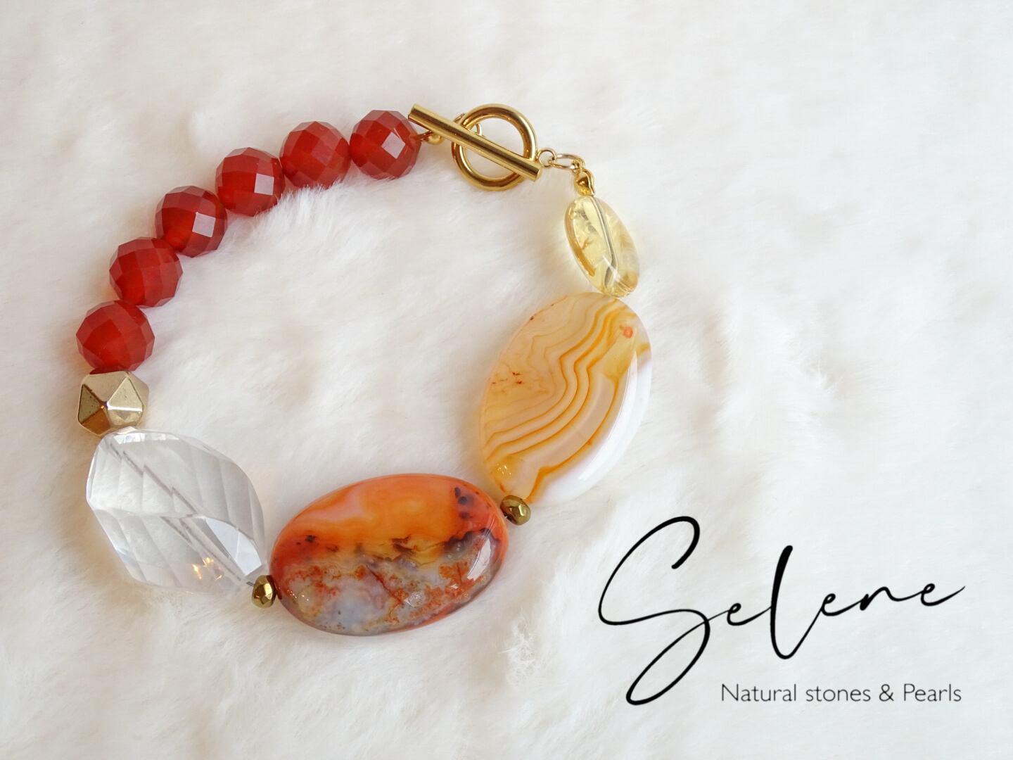 大粒の煌めくクリスタルと美しい縞模様のアゲート(めのう)、透明感のあるレッドアゲートをヘマタイトがしっかりと引き締め、一粒のシトリンが優しく輝き融合した、腕元を彩るブレスレットが登場しました。天然石の美しさを存分に引き出すデザインと、手首に心地よくフィットするサイズ感が特徴です。 クリスタルはその透明感と輝きで、まるで神秘の水を閉じ込めたかのような美しさ。一方、アゲートはその深みのある色合いと石目模様が、どんなスタイルにもアクセントを加えます。 このブレスレットは、普段使いはもちろん、特別な日のコーディネートにもぴったり。オフィスやパーティーなど、様々なシーンで輝きを放ちます。 自然の神秘とも言えるクリスタルと瑪瑙の美しさを身にまとい、日々の暮らしにちょっぴり贅沢な輝きをプラスしませんか。 天然石は一つ一つ個性がありますので、写真と実物では石目や色味が異なる場合がございます。予めご了承ください。