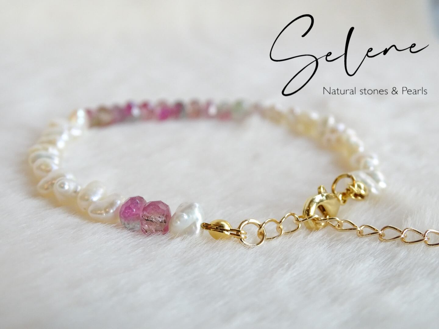 バイカラートルマリンの鮮やかな色合いとパールのエレガントな輝きが、手首を美しく彩ります。あなたの日常に幸せなエネルギーをもたらし、日常から特別な日の装いまでをより一層引き立ててくれることでしょう。自分へのご褒美や大切な人への贈り物にも最適です。