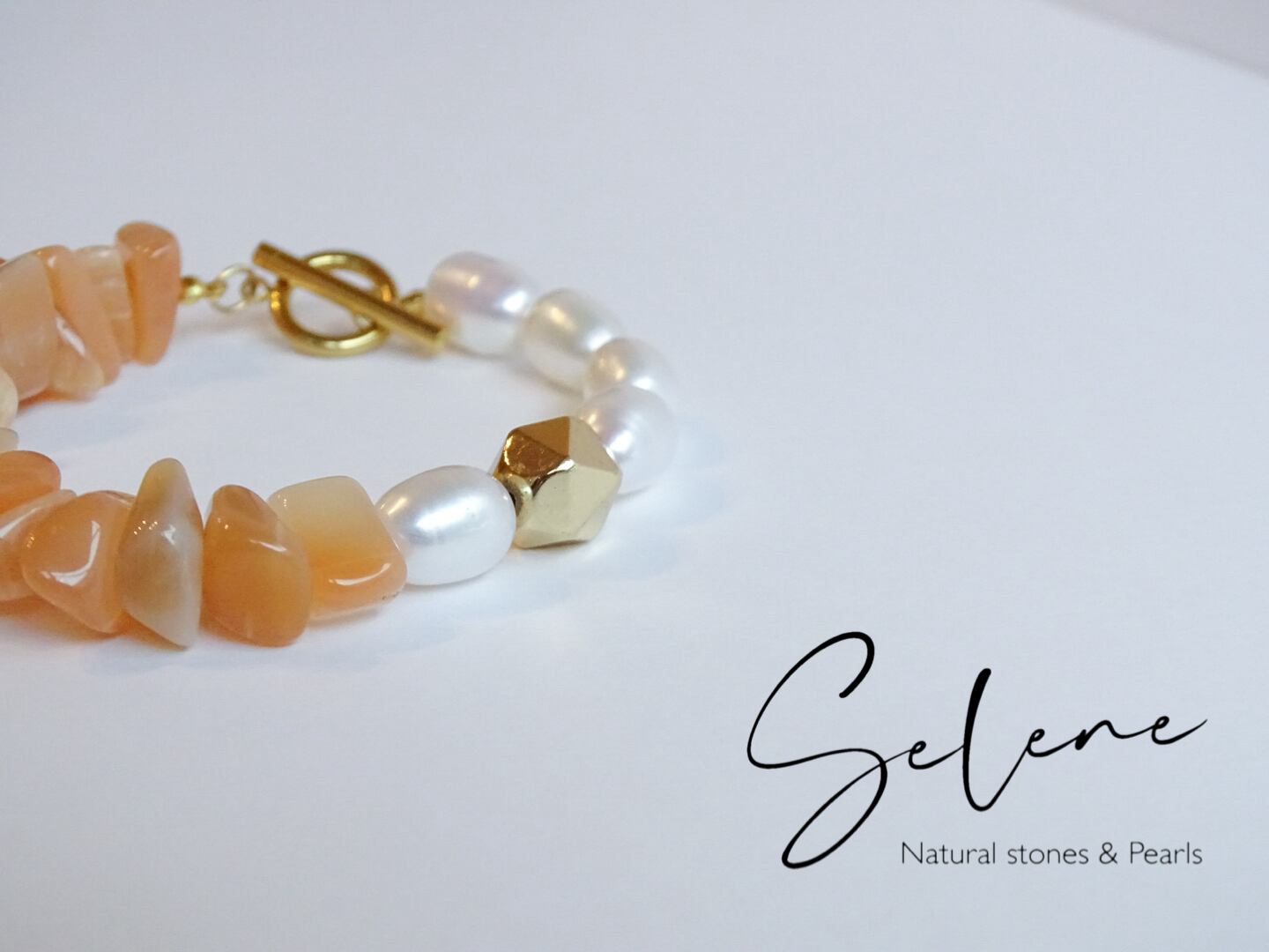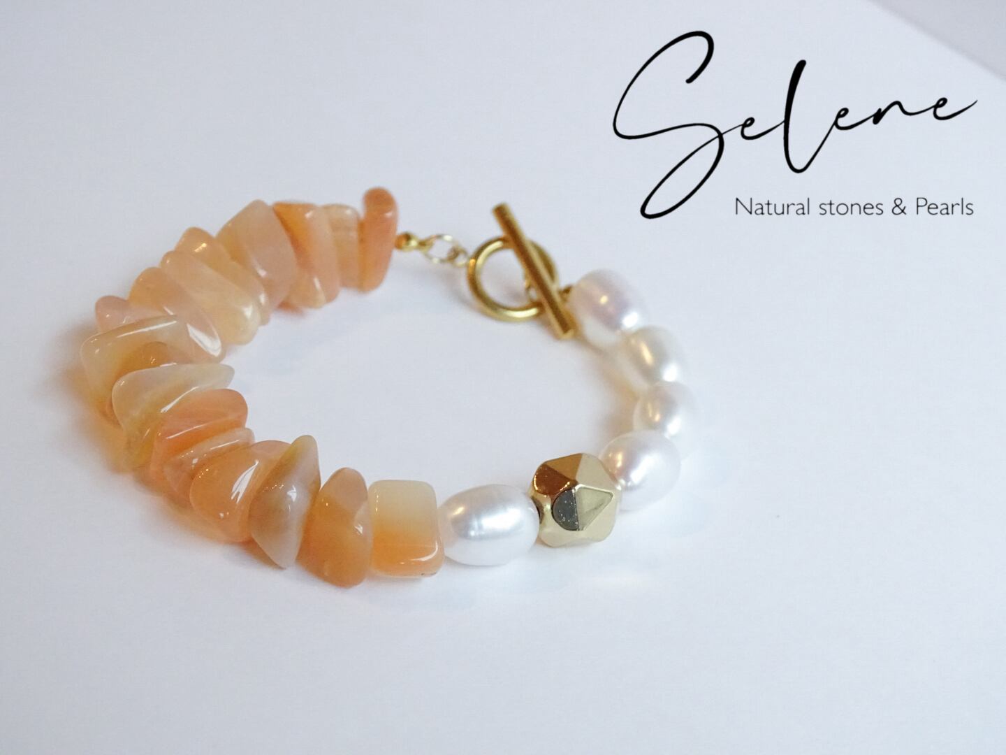 オレンジムーンストーン、ヘマタイト、パールの見事なコンビネーションでハンドメイドされたこのブレスレットは、個性的でエレガントなジュエリーを好む方にとって、まさに虜にする美しさ。 煌めくムーンストーンが神秘性と女性らしさを、グラウンディング効果のあるヘマタイトが強さと守護をもたらします。 繊細なパールが洗練された雰囲気を醸し出し、このブレスレットはどんなシーンにも使える万能アクセサリーです。 このブレスレットを身につけるたびに、宝石の美しさとエネルギーがあなたにパワーを与え、インスピレーションを与えてくれることでしょう。是非、自分へのご褒美や大切な方への贈り物としてお求めください。